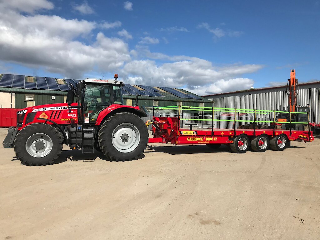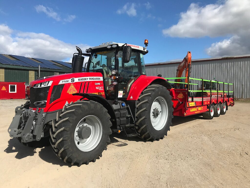 Garriock Bros.Ltd have a range of plant available to hire from our Inverness depot. Below we show images of our Massey Ferguson 7726 S Dyna VT (GB2474), specifications: 260hp, Fully Auto 50kph box with variable transmission, Cab Suspension' Front axle suspension, Air brakes, Front Linkage, GPS Ready and Trelleborg tyres.