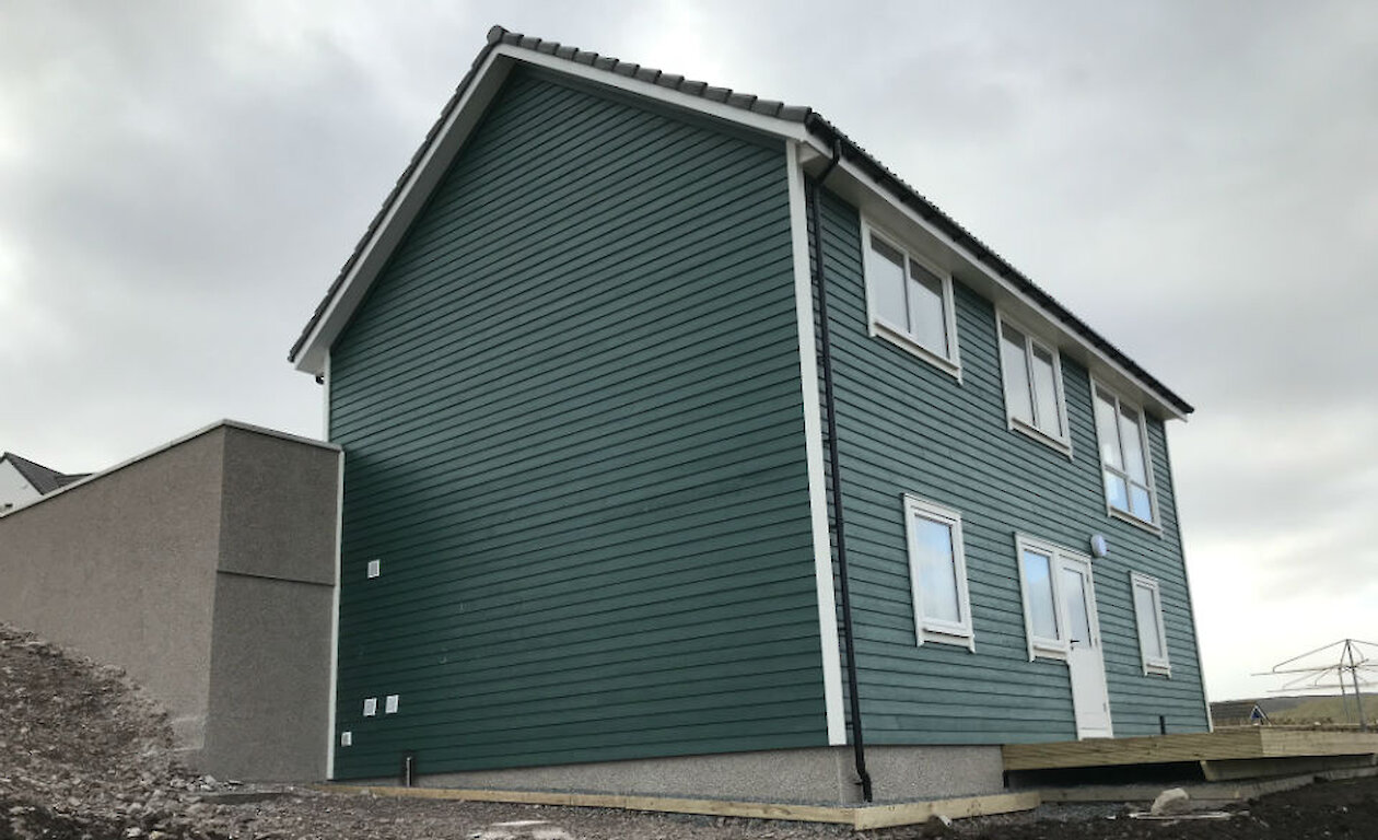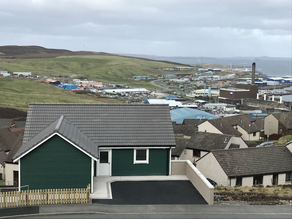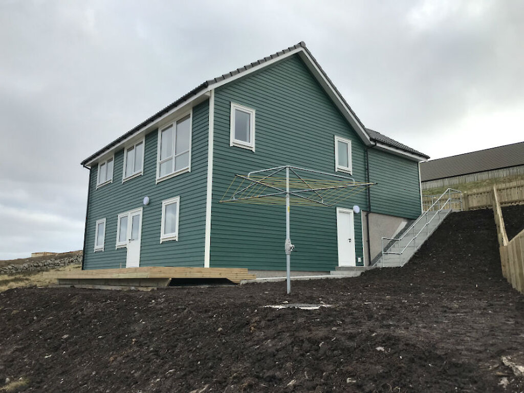 Situated in the north of Lerwick with panoramic views north and on to Whalsay. This new build has been timber clad with a concrete tiled roof, UPVC windows, facias and soffits. It has a heat recovery system with underfloor heating downstairs and radiators upstairs. A decked terrace on the lower level to the rear.